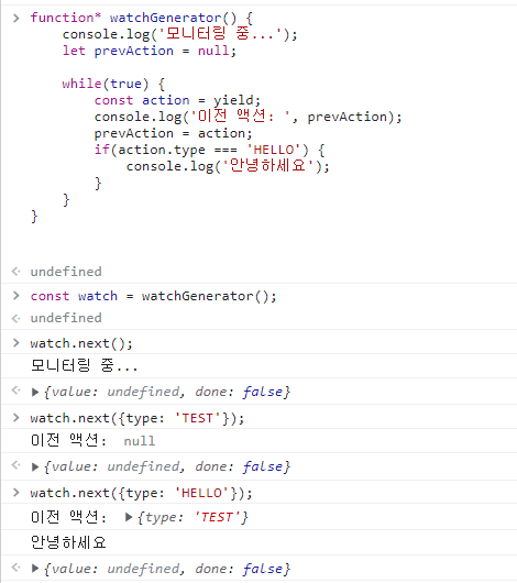 아래 코드는 redux-saga의 작동 원리를 이해하기 위한 간단한 제너레이터 함수 사용 예시이다.