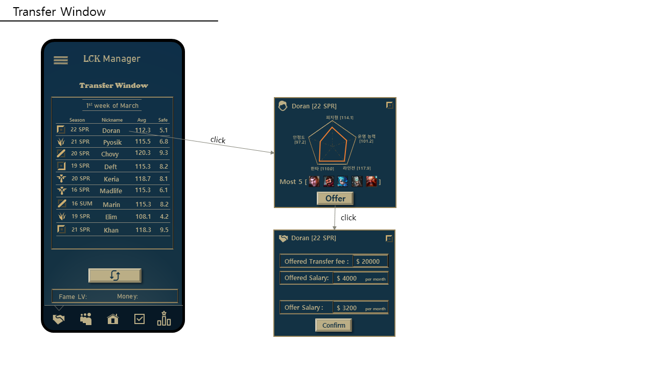 로그인, 팀 선정, 선수 영입, 이적 시장, 경기 일정 등의 기본 UI 제작 후에 인게임적인 요소를 넣고 마지막으로 디자인을 싹 고쳐 배포하는 것이 내 최종 목표였다.