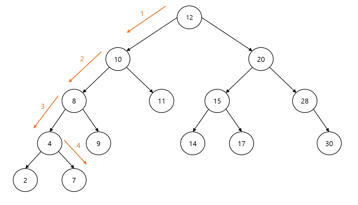 위 트리에서 숫자 7을 검색하려면, 아래 그림과 같이 4번의 이동만 하면 된다.