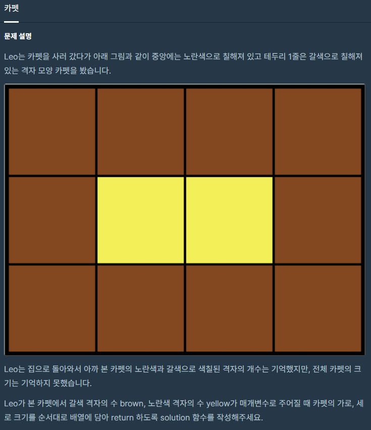 사실 복잡해보이지만, 진짜 단순하게 생각하면 결국 카펫의 넓이는 노란 타일 부분의 가로와 세로 부분에 각각 +2씩하여 넓이를 구하면 된다.