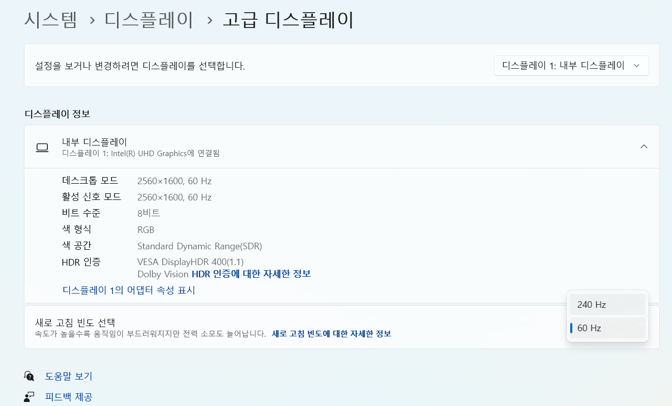 실제로, 연결한 모니터들은 60Hz인데 노트북 자체 화면이 240Hz로 설정이 되어 있었다.