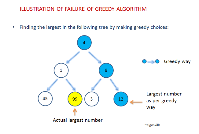 다음의 각 노드에서 값이 가장 큰 경우를 좇아 가장 큰 값을 구하려고 하지만, 실제 가장 큰 값과 Greedy Way를 따라 구한 근사치가 차이가 난다.