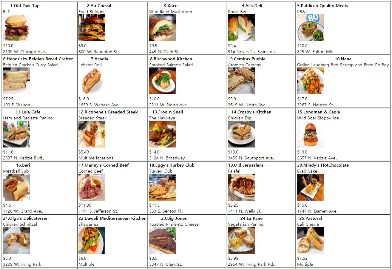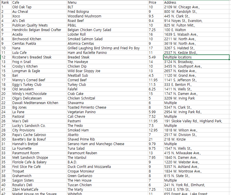 mc.readExcel("../../filetest/sandwichs/best_sandwiches_list_chicago_price_address.xls");