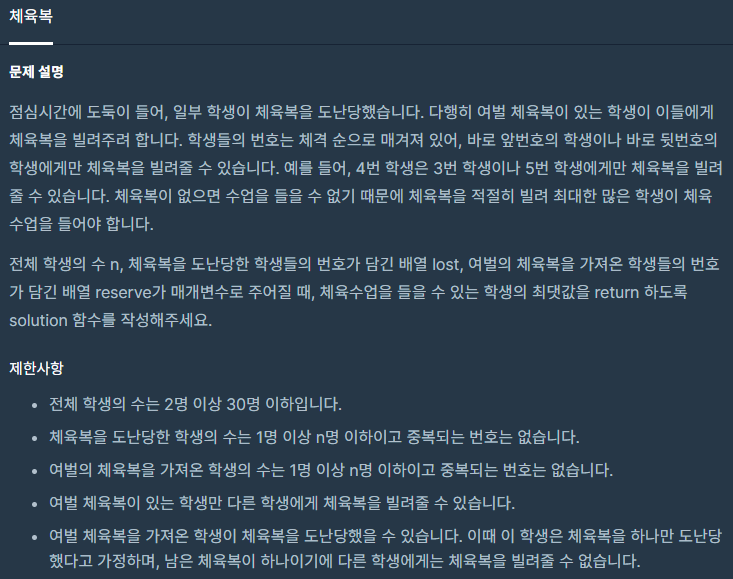 체육복의 여벌이 있는 학생이 체육복을 도둑맞았을 때는 자신의 체육복을 써야 하므로, reserve 배열에서 빠져야 한다는 점을 제외하고는 크게 문제 될 게 없는 문제이다.