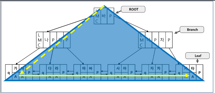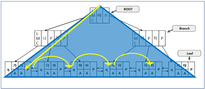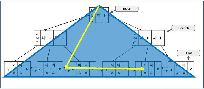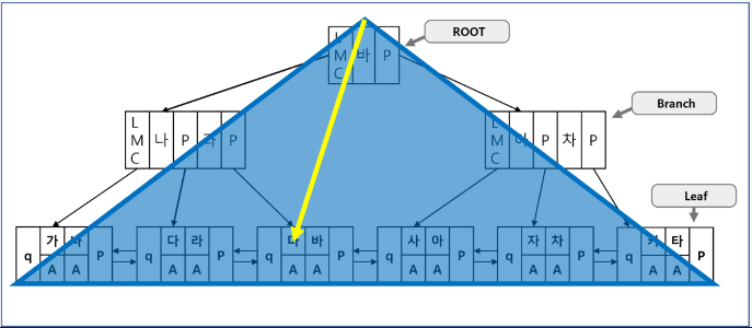 - 루트 블록에서 시작하여 브랜치 블록을 거쳐 리프 블록까지 내려가서 최종 데이터가 저장된 테이블 목록을 읽어 단 한 건을 찾는 방식이다.