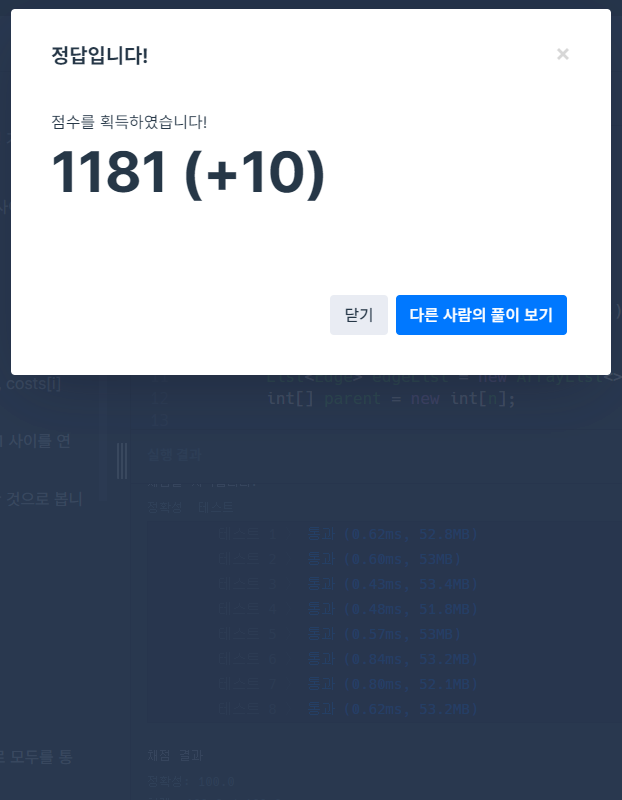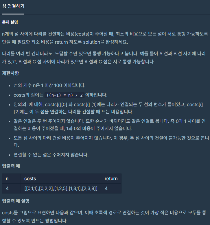 굉장히 익숙한 그림이다. 사실, 어제 이 문제를 풀다가 도저히 안 되겠어서 Union-Finf, Kruskal 알고리즘을 공부하고 왔다... 하하 LV3 문제들은 보통 이런 선행학습이 꼭 필요한 경우들이 많아서...ㅠ