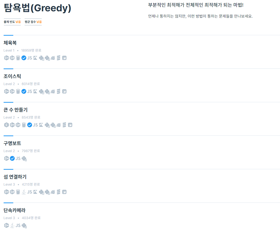 아직 Greedy 활용 문제들이 많이 어려워서 LV2 문제 딱 하나만 더 풀었으면 좋겠는데...