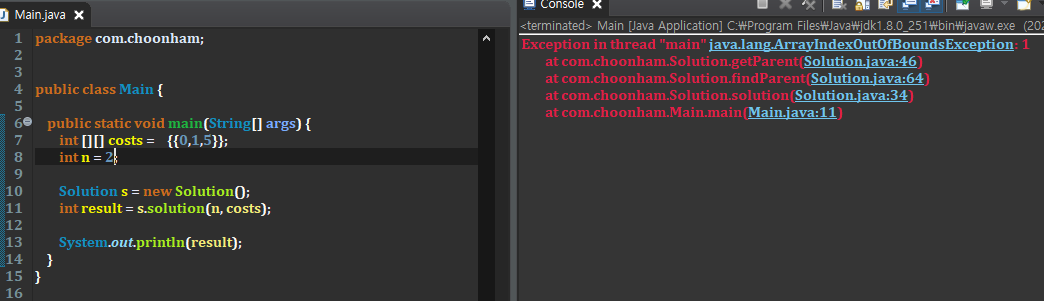 parent 배열의 선언부에서 int[] parent = new int[costs.length] --> int[] parent = new int[n] 로 바꿔주면 해결 가능한 에러이다.