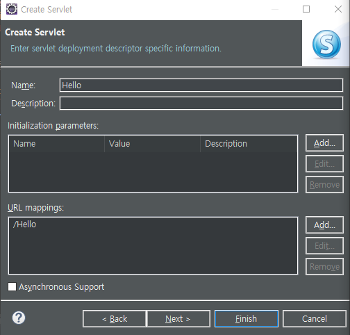 다음과 같은 화면이 나오는데, Description은 해당 Servlet에 대한 설명을 간단히 적어주면 되고(생략 가능), 그 밑에 URL mapping은 주소창에 직접 표출되는 정보이니, 수정해서 원하는 주소명으로 바꿔도 된다.