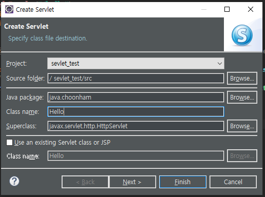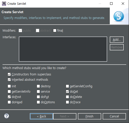 next를 한번 더 누르면, 위 화면으로 넘어온다. 이 작업에서는 생성자의 생성 여부, 추상 메서드 사용 여부 등을 체크하면 된다. (이번 포스팅에서는 doGet() 메서드만 사용한다.)